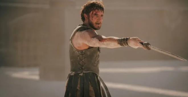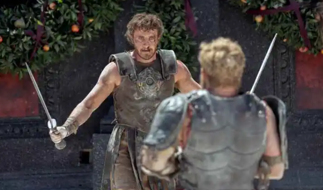 光从这样看下来,《神鬼战士2》剧情跟2000 年《神鬼战士》没有太多差异,都是主角在遭受在位者压迫的痛苦之后,为了帮已故的妻子报仇,在竞技场上击败一个又一个对手的故事,但有趣的是,时隔这么多年,近期拍了《Gucci豪门谋杀案》、《拿破仑》等强调权力斗争的作品的导演雷利史考特,这次也把更多篇幅放在罗马皇室的内部风暴之上,透过主角卢赛斯与奴隶主里努斯的层层上位,看见这个帝国腐败的真实样貌。